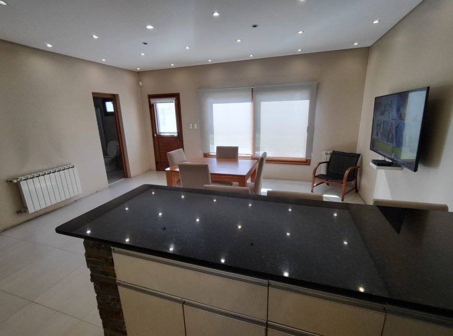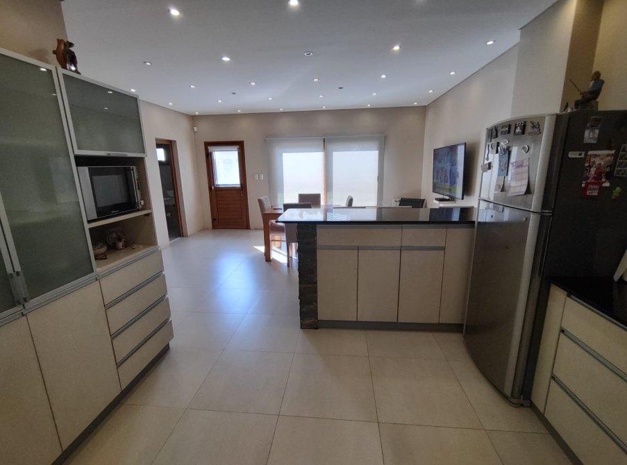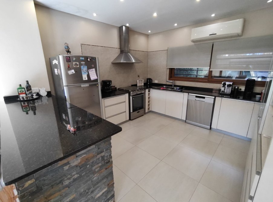 posee una amplia cocina con comedor diario , desayunador, con muebles bajo mesada de granito negro y alacena,espacios de guardado ,campana de acero